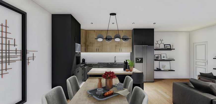 U ovom enterijeru dnevna soba, trpezarija i kuhinja oblikovane su kao jedinstvena, skladna cjelina koja spaja toplinu prirodnih materijala sa suptilnim klasičnim detaljima. Prostor odiše mirnoćom, jednostavnošću i profinjenom estetikom, stvarajući idealno okruženje za svakodnevni boravak i okupljanje. Maslinastozelene nijanse, bež tonovi i akcenti od prirodnog drveta pažljivo su usklađeni kako bi doprinijeli osjećaju topline i ugodnosti. Dekorativne zidne lajsne i petvice unose klasičnu eleganciju, dok otvoren raspored prostorija omogućava prirodan protok svjetlosti i nesmetano funkcionisanje. Trpezarija i kuhinja – prostor osmišljen za trenutke zajedništva Kuhinja i trpezarija povezane su u otvoreni koncept toplih tonova i prirodnih tekstura. Centralno mjesto zauzima drveni trpezarijski sto, koji svojom rustičnom pojavom unosi dodatnu toplinu i karakter. Meke boje, jednostavne linije i taktilni materijali stvaraju prijatnu i smirenu atmosferu. Enterijer je pažljivo dizajniran tako da podstiče boravak, druženje i uživanje u svakodnevnim ritualima, balansirajući funkcionalnost sa estetskim vrijednostima. Svaki detalj doprinosi osjećaju doma – autentičnog, udobnog i nadahnjujućeg prostora.